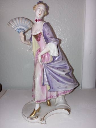gold touches perfectly detail her clothing. The Lady is in beautiful condition, no chips or cracks. Alas, her fan has been reattached professionally, and there is an adhesive (easily removable) on the bottom, from having been on a lamp base.