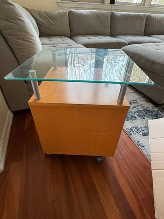 Glass top Coffee table with storage & Glass top End table with storage Both are on wheels Dimensions: Coffee table- 53”W x 30”D x 17.5”H End table- 21” x 21” x 21” Pickup only