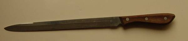 (1) Royal Norfolk Cutlery Stainless Steel, measures 12”. (2) Stainless Steel with bone handle measures 12 ½”. (3) Revereware serrated knife measures 8” blade with 5” handle. (4) Vintage "EMPEROR...