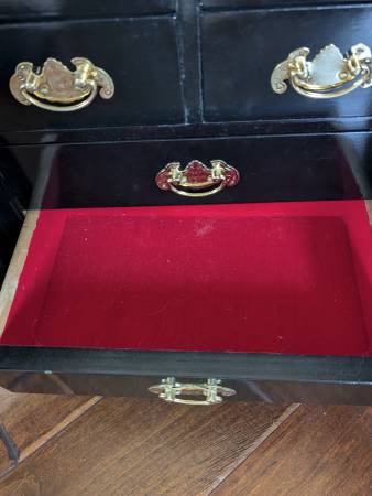 Vintage Chinese hand painted black lacquer jewelry chest 15 in is tall, 15 and 1/2 in wide. 9 in deep. In excellent condition. Features 6 pullout draws two larger ones at the bottom and four smaller...