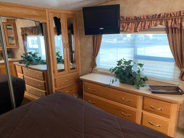 2004 Travel trailer, 29' in excellent shape. In storage is Grover Beach, ca. Outside paint has weathered over the years , nonetheless, inside is in excellent condition ; has tiffany lights dining light, wood flooring throughout , washer dryer hookups inside trailer, two tv's, new tires, queen size bed, and living room sofa makes into a bed, two tan leather recliners with foot stools (see pics), day and night blinds, all accessories are sold with trailer, like recline chairs, blankets, weaved matt for outside the trailer, pots n pans, movies, bedding, some clothes, etc.. the trailer is beautiful inside, tint windows dining table with chairs, etc. custom valences matched bedspread but don’t have bedspread. Make it custom for you ! The canopy is detached from trailer and is stored in Willow RV . This model brand new you would have a huge payment of years with interest rates. Brand new around 50k to 70k depending on the extras, model, etc, Inside is really nice. Registration is current.